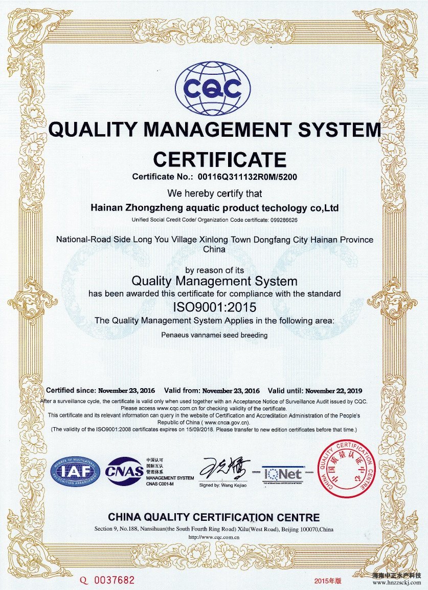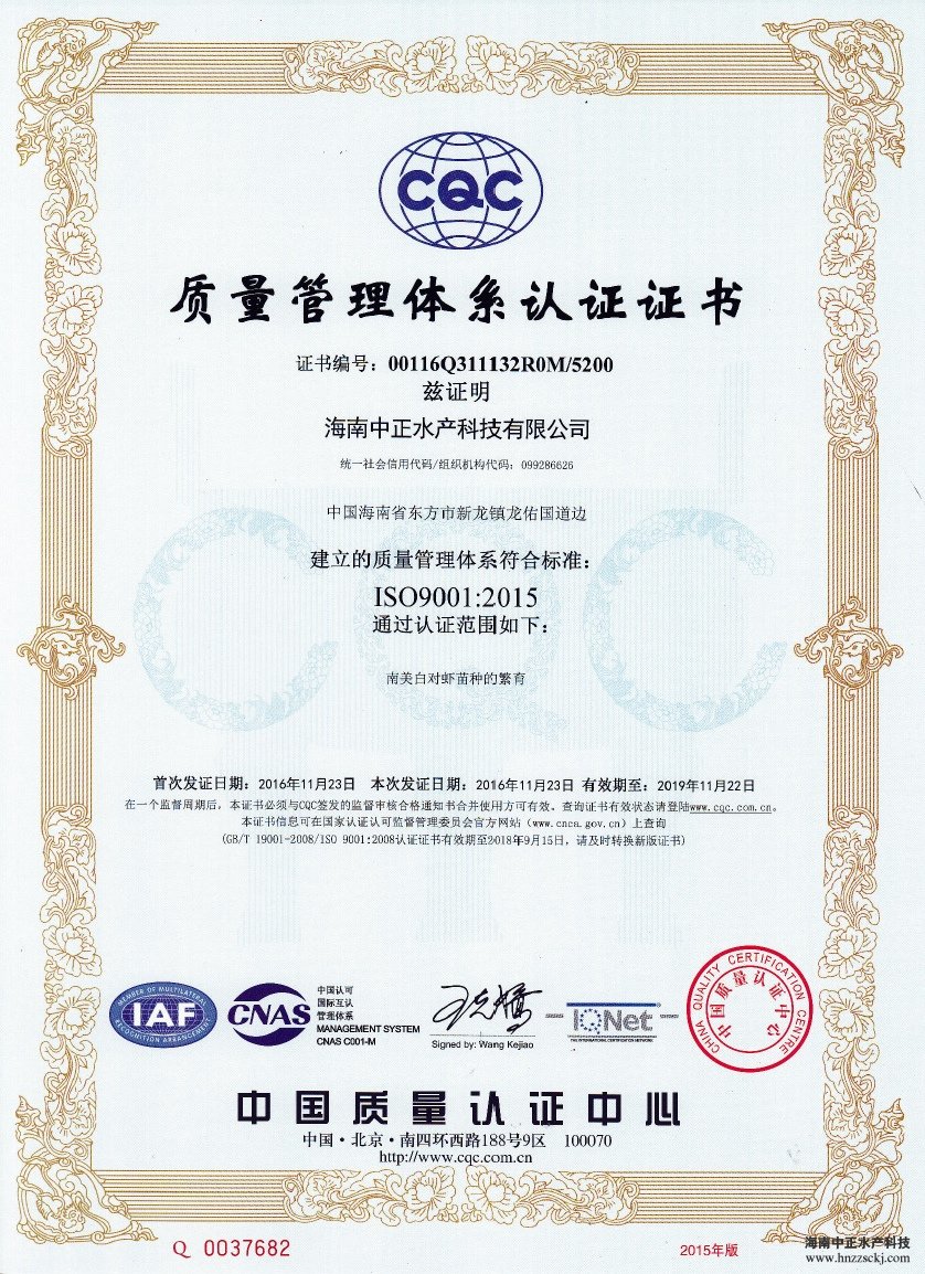 乐动网页版,继先后荣获中国南美白对虾苗“新锐企业”和“2016中国水产行业十大健康安全种苗品牌”称号后,于2016年12月,又顺利通过了ISO9001:2015国际标准化质量管理体系认证和国际认证联盟(IQNet)质量认证。